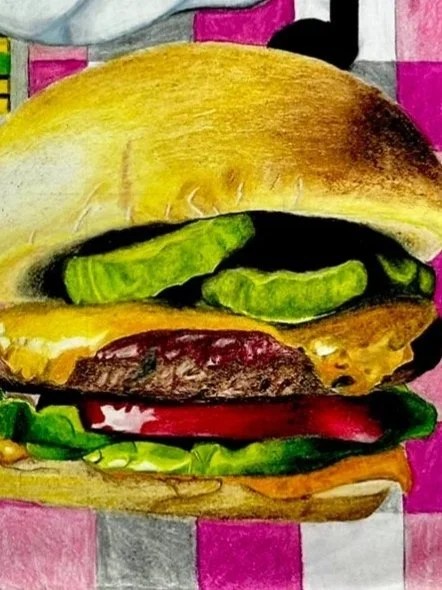 I decided to make the drawing have a retro diner theme. I wanted to incorporate all the things I think of when I picture a retro diner; jukebox, vinyl records, neon diner sign, banana split, a road sign, and a big hamburger. I wanted it to be visually interesting and feel chaotic because diners usually are.