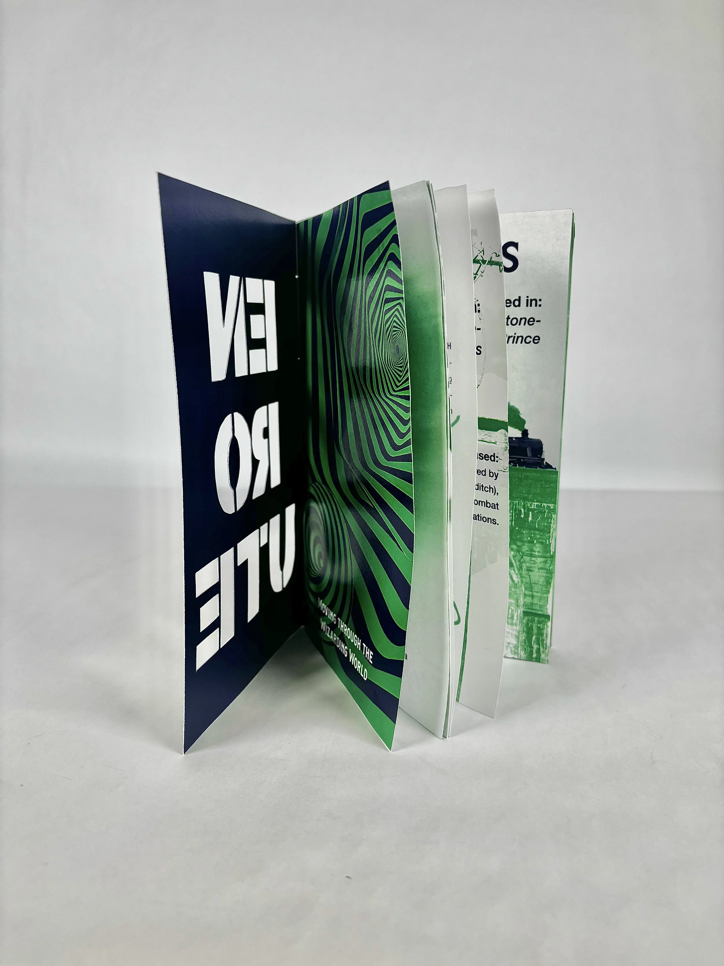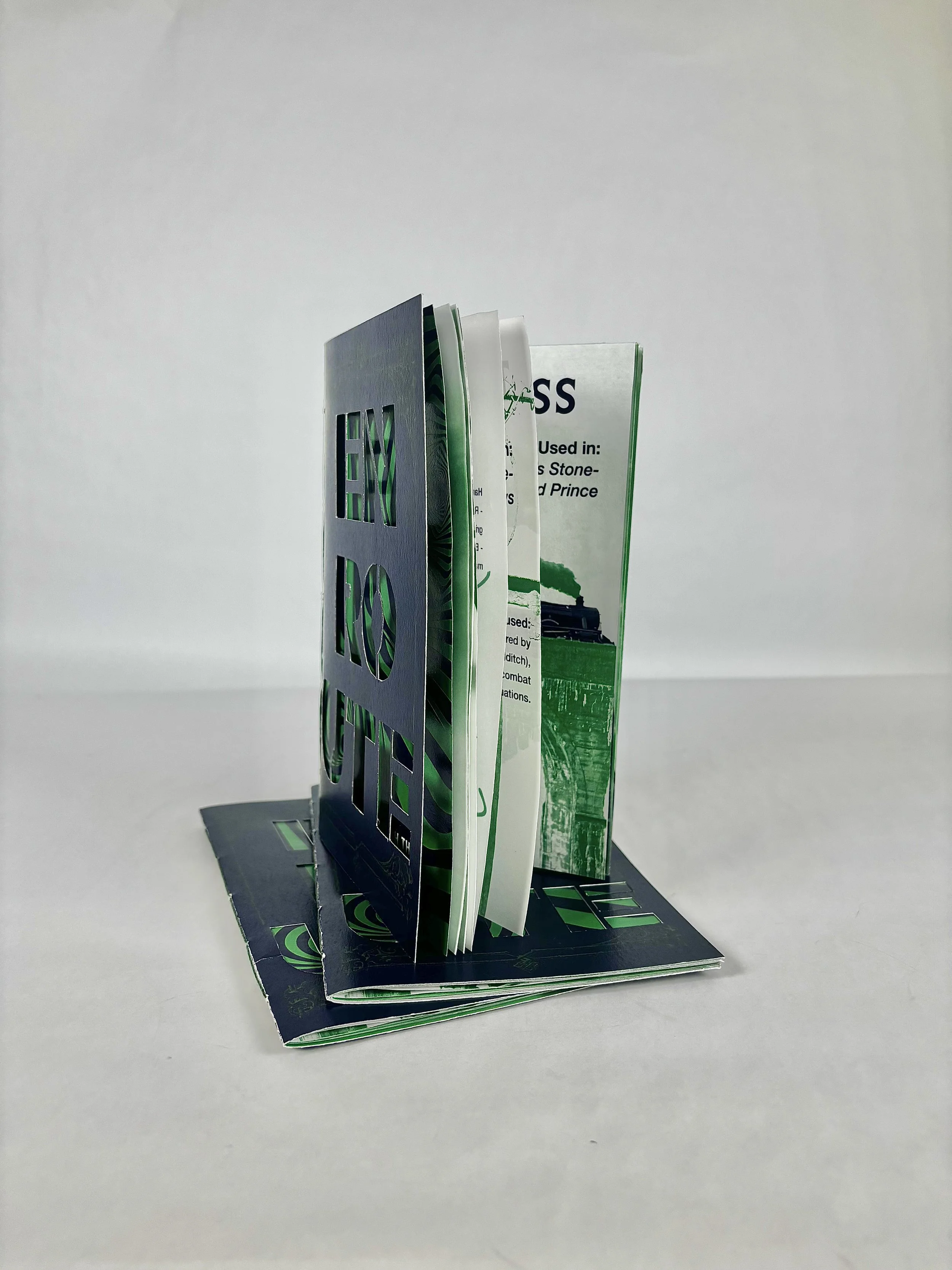I wanted there to be a theme of movement throughout the zine. For the masthead (cover), I cut out the letters of “En Route” to symbolize a portal. For the other pages, I used perspective and depth to relay movement. For the experimental portion of the project, I added vellum pages, used duoton colors, and, as I said previously, I cut out the masthead. I did a stationary binding when it came to assembling the pages. This was such a fun project, and I enjoyed learning more about zines.